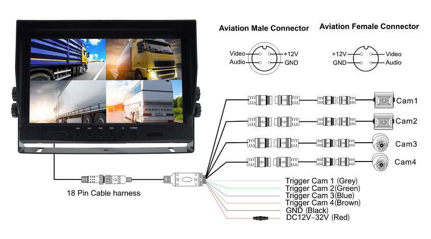 18Pin Cable Harness- Simultaneously connected to 4X1080p cameras, the displayed images are free of interference