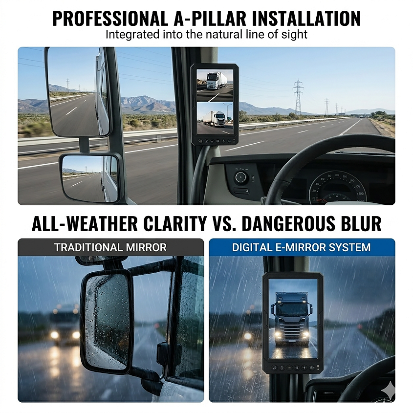 A: It is designed for professional fleet integration. The system uses standard 4-pin aviation connectors for a stable, plug-and-play connection between the cameras and monitors. We provide dedicated A-pillar mounting brackets that fit most major truck brands (Volvo, Scania, Freightliner, etc.) with minimal cabin modification.