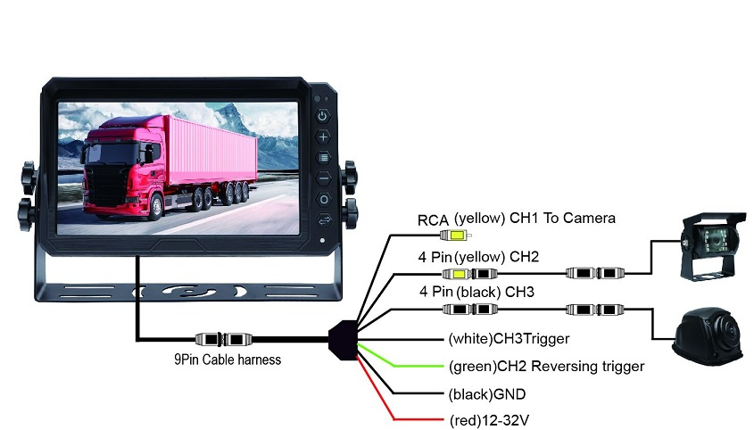 Item number: ST-722RVM, 7-inch 1080P Rearview Monitor with 3 Channel, 3 video input, 2 trigger wires, you can connect rear, side, and front cameras for maximum visibility and safer maneuvering,it perfect for trucks, vans, RVs, buses, trailers, agricultural machinery, forklifts, and industrial vehicles.