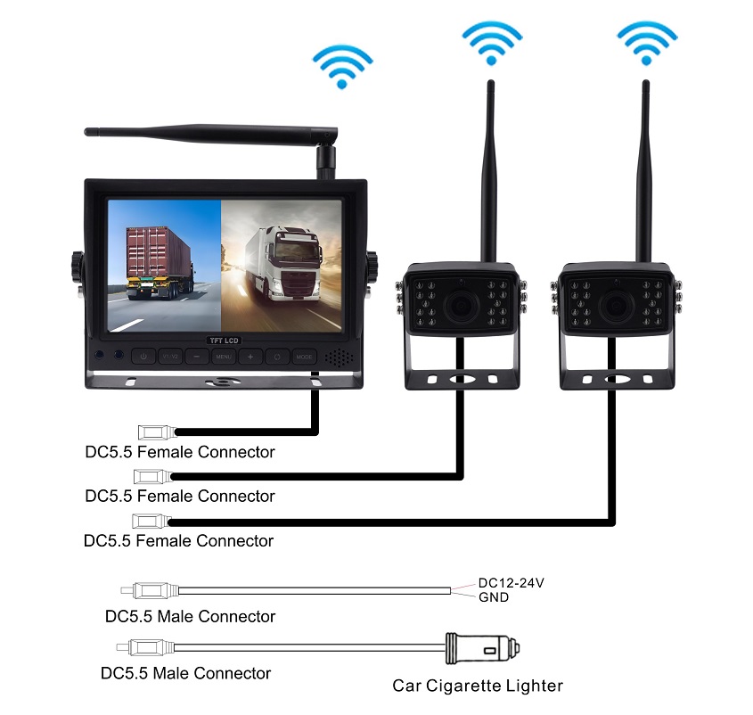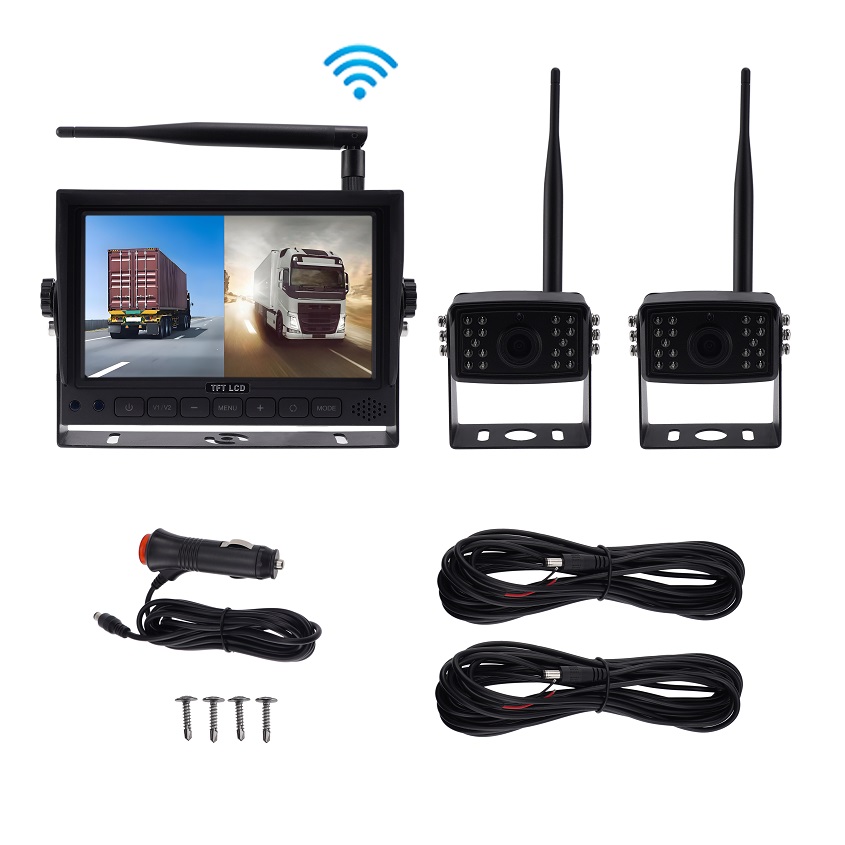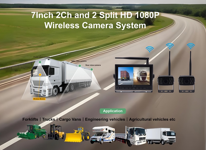 The 7-Inch 2CH Split 1080P Wireless Camera System is a reliable and easy-to-install vehicle monitoring solution designed for trucks, trailers, RVs, and agricultural or construction equipment. With full HD resolution, dual-channel display, and stable wireless transmission, it provides drivers with clear, real-time views for safer reversing and driving