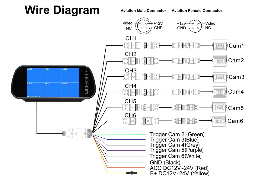 | Trigger | 5 trigger wires, if without video recorder function, have 6 trigger wires |