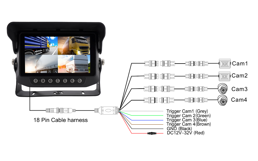 The 7-inch 1080P Quad Waterproof Monitor is designed for trucks, RVs, trailers, buses, and heavy-duty machinery that require a reliable multi-view monitoring solution. Featuring a true HD 1080P display, IP69K waterproof construction, and four camera inputs, this monitor provides clear visibility in all driving in harsh environments.
