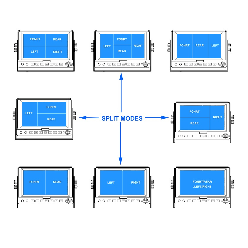 Standtop's 7" high-definition 1080P quad screen monitor,can display up to 4 screens at the same time,can use different split modes according to different usage scenarios,from 1 screen to 4 screens,each channel is equipped with a trigger line,DVR function is optional,can record video clips, providing a reliable solution for capturing important moments in the driving process, Its multi-channel capability makes it ideal for vehicles that require monitoring of multiple cameras at once.