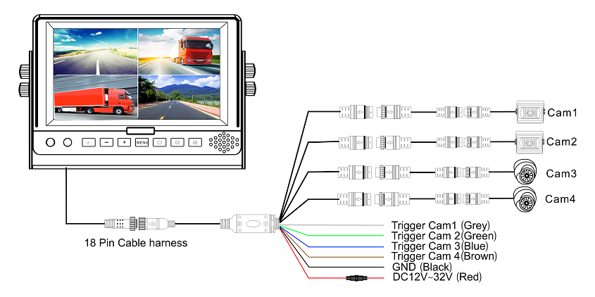 18Pin Cable Harness- Simultaneously connected to 4X1080p cameras, the displayed images are free of interference