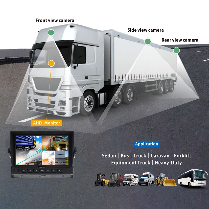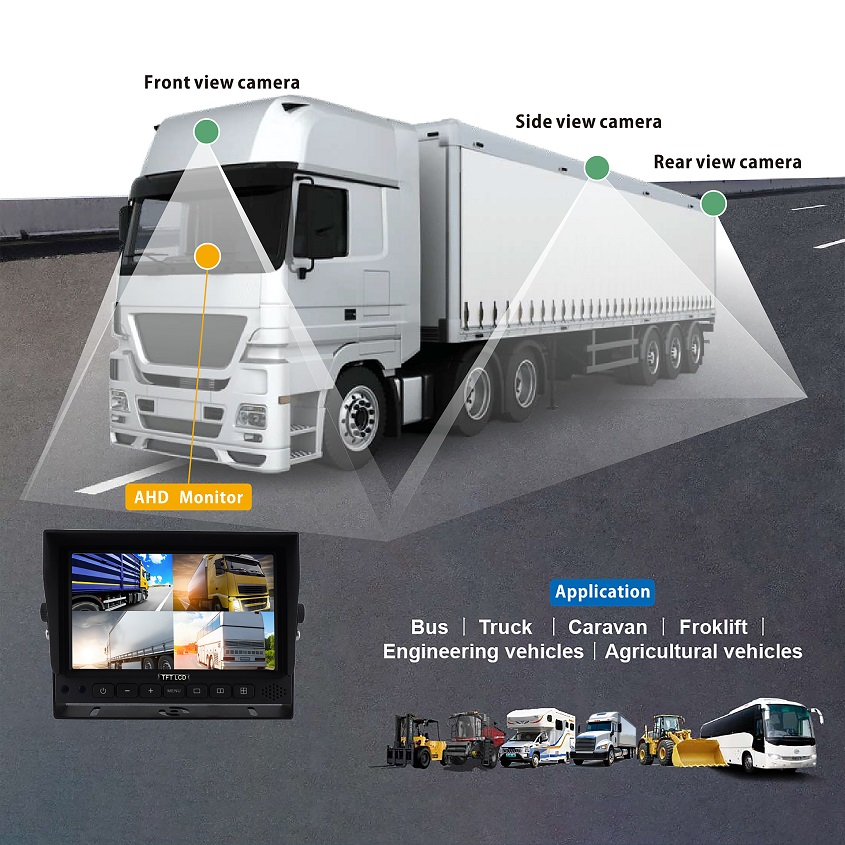 Item number: ST-799Q-AHD, ECE R10 & CE certificates, The 7-inch HD 1080P Heavy Duty Quad Rearview Monitor provides four-channel viewing with crystal-clear AHD video, video recording function optional, ideal for trucks, RVs, buses, vans, trailers, and heavy machinery. Supports 4 cameras simultaneously with single, dual, triple, and quad-split modes for maximum driving safety