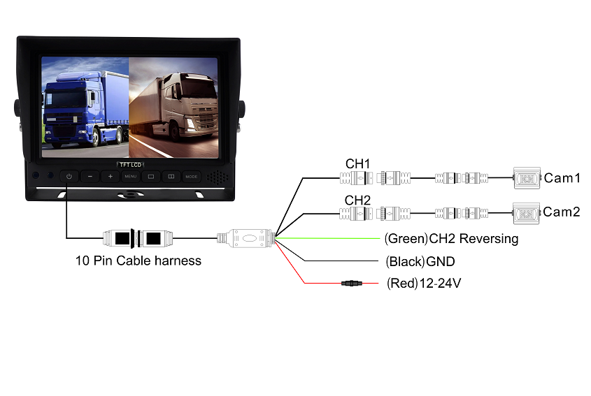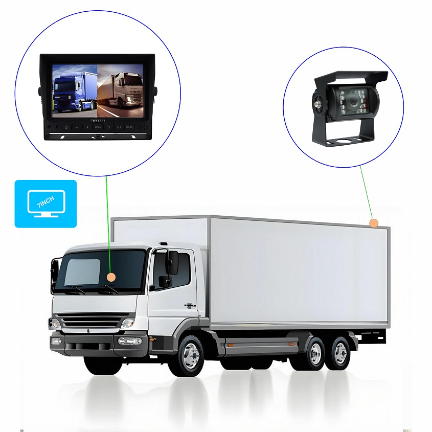 Item number: ST-799AHD-2P, ECE R10, CE Certificates,7" 1080p 2 split display, supports full-screen and split-screen modes, video recording function optional, wide voltage 9-36V, drivers can view rear, side, or front angles simultaneously, Ideal for trucks, trailers, RVs, vans, agriculture machines, forklifts, and other commercial vehicles